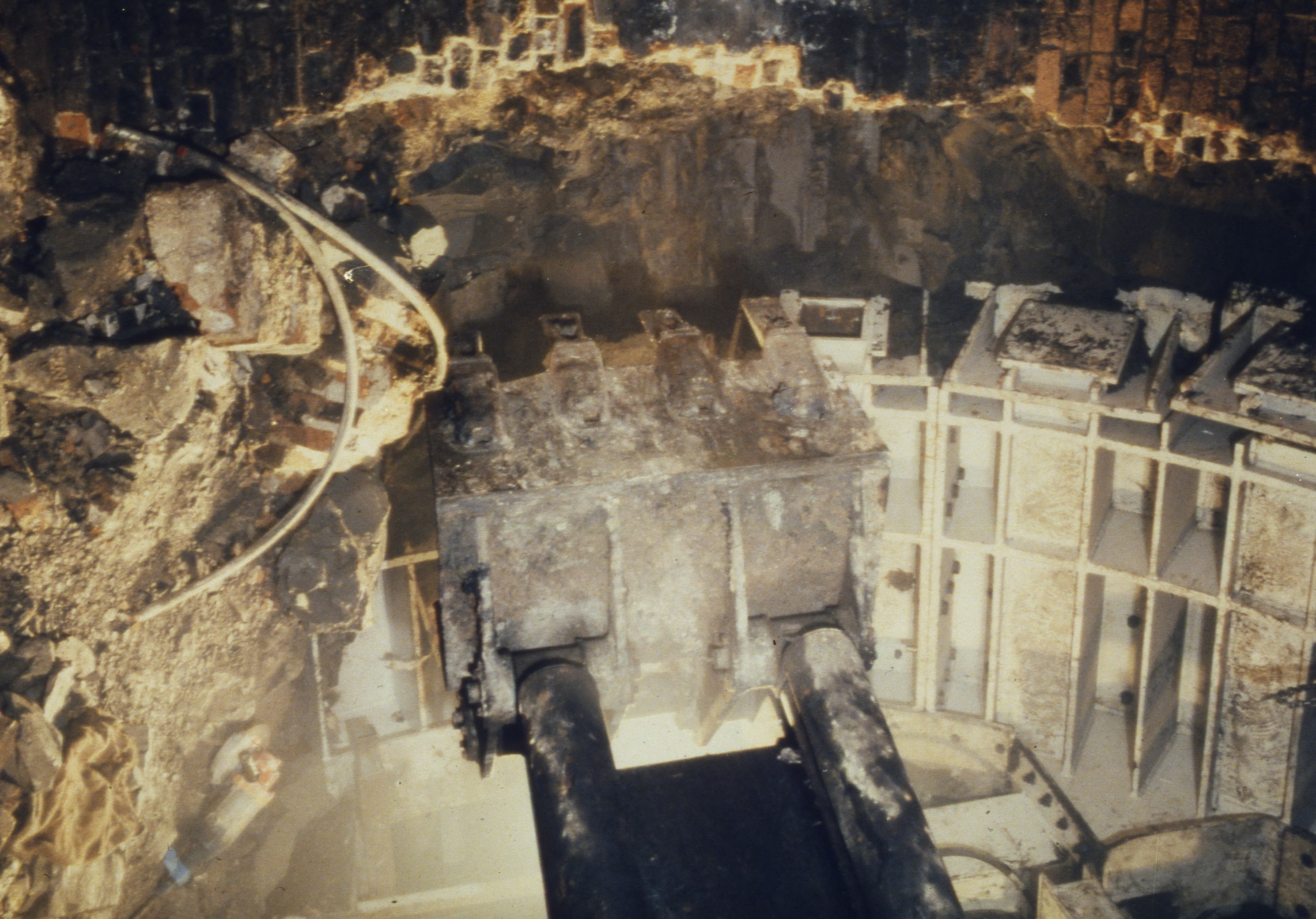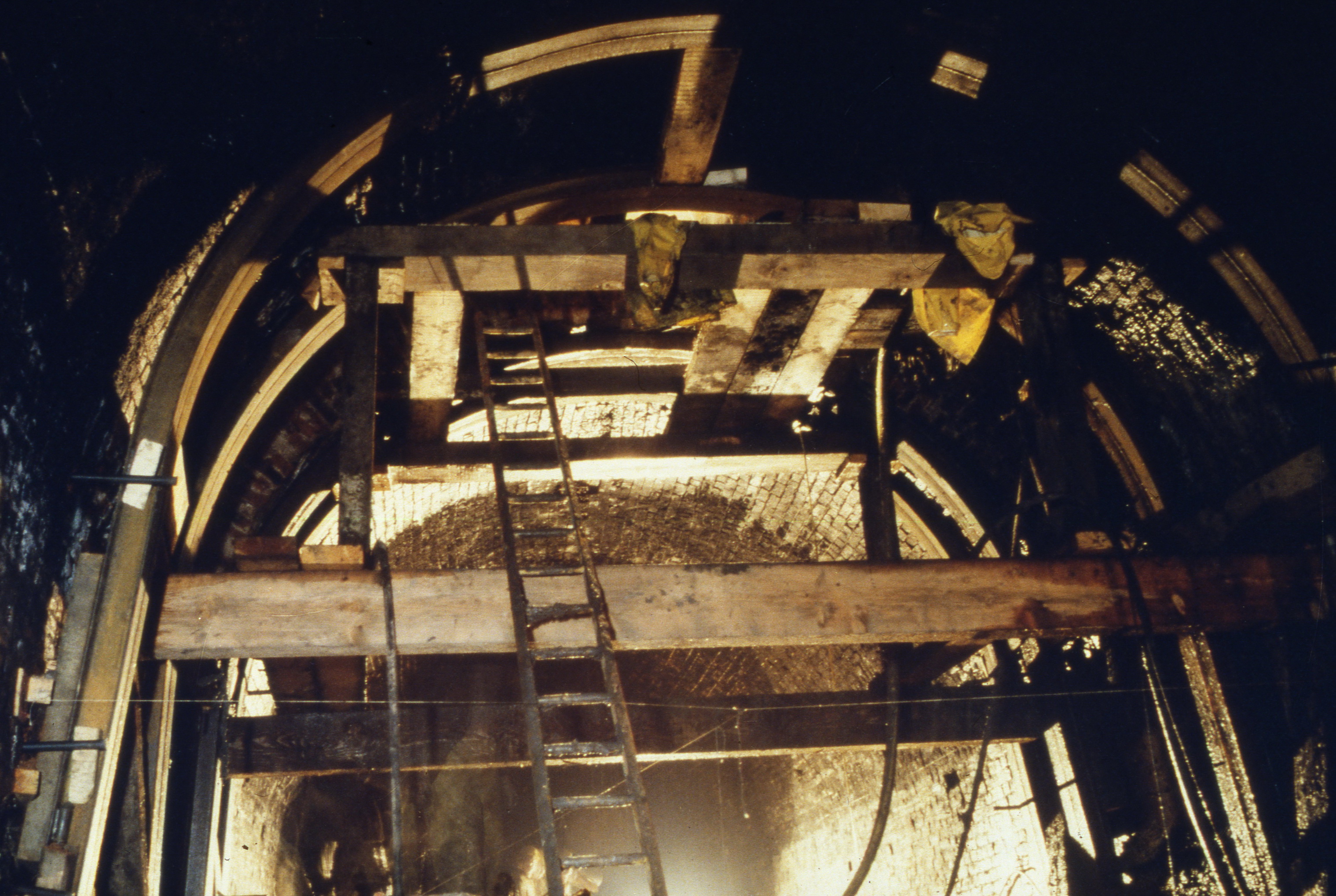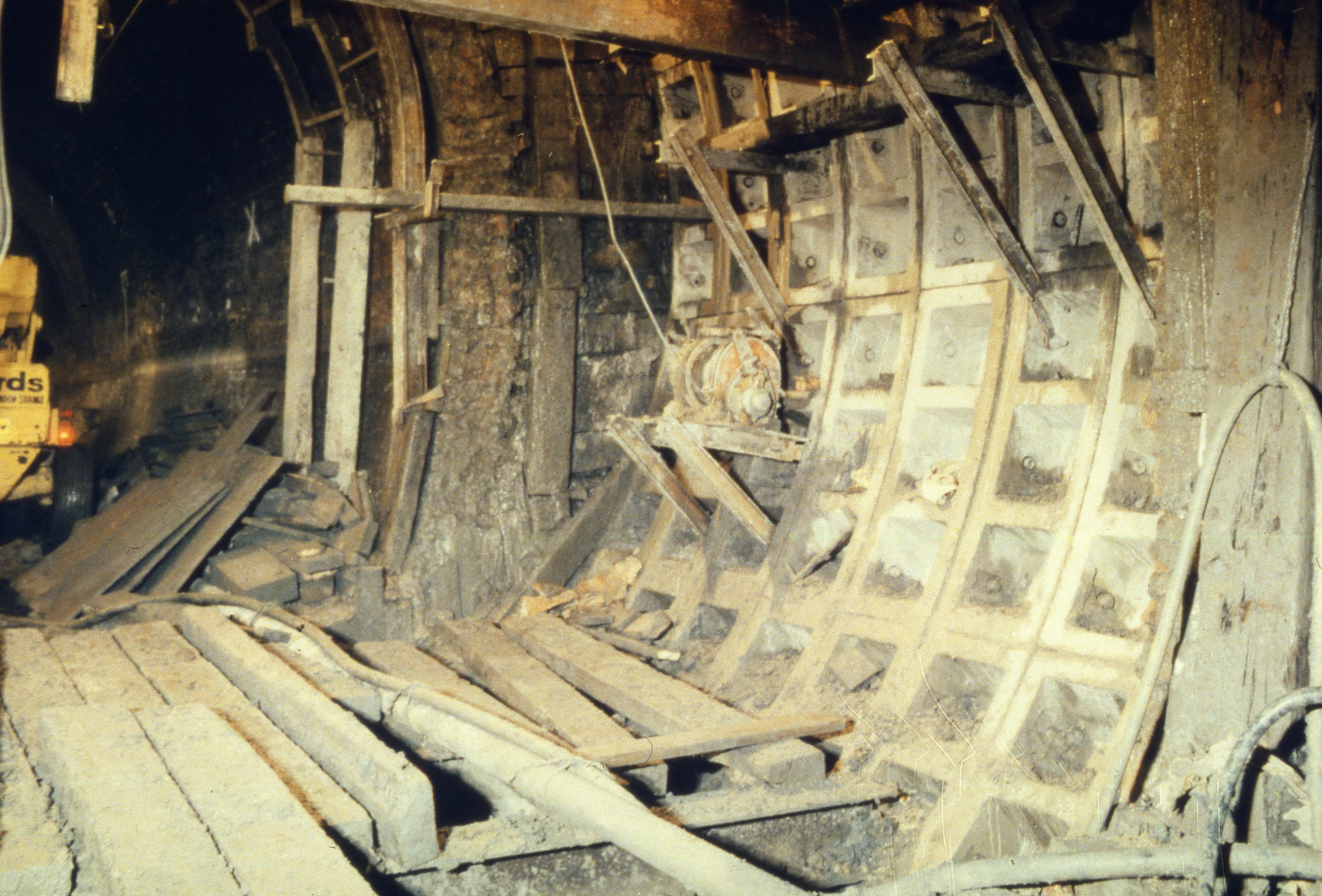 The seven steel arches were braced against the roof of the tunnel by an ‘A’ frame in front of the excavating head of the shield to prevent any progressive uncontrolled collapse of the old tunnel.