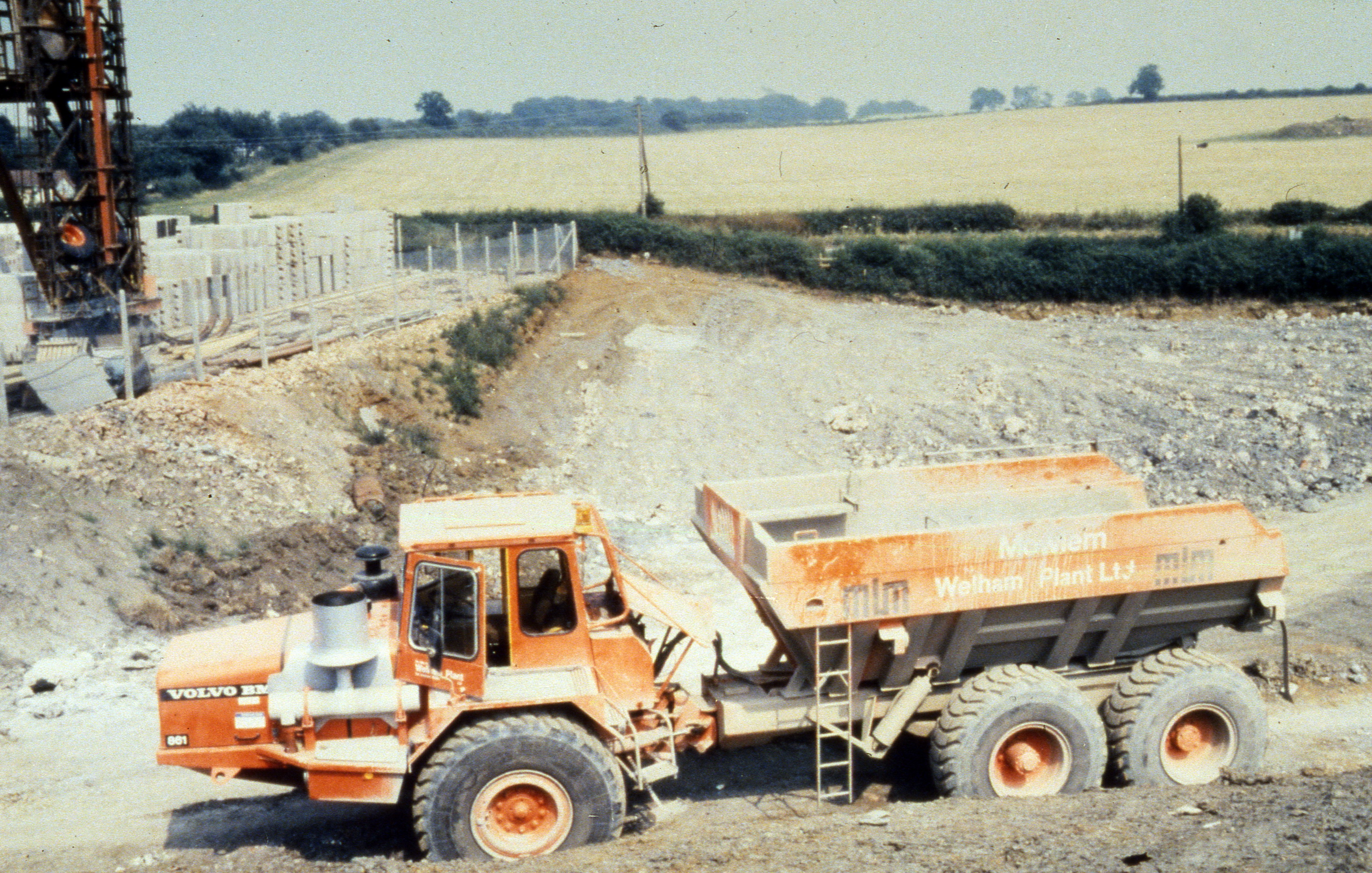 The dumper trucks were articulated Volvo 861 vehicles, and provided the transport system by which the concrete segments were brought in to the work site, and the excavated material was taken away. As there was no room for the lorries to turn in the tunnel, they reversed in and drove out. Two return journeys of the Volvos were required for each ring lining; two loads of spoil out and two loads of concrete segments in.