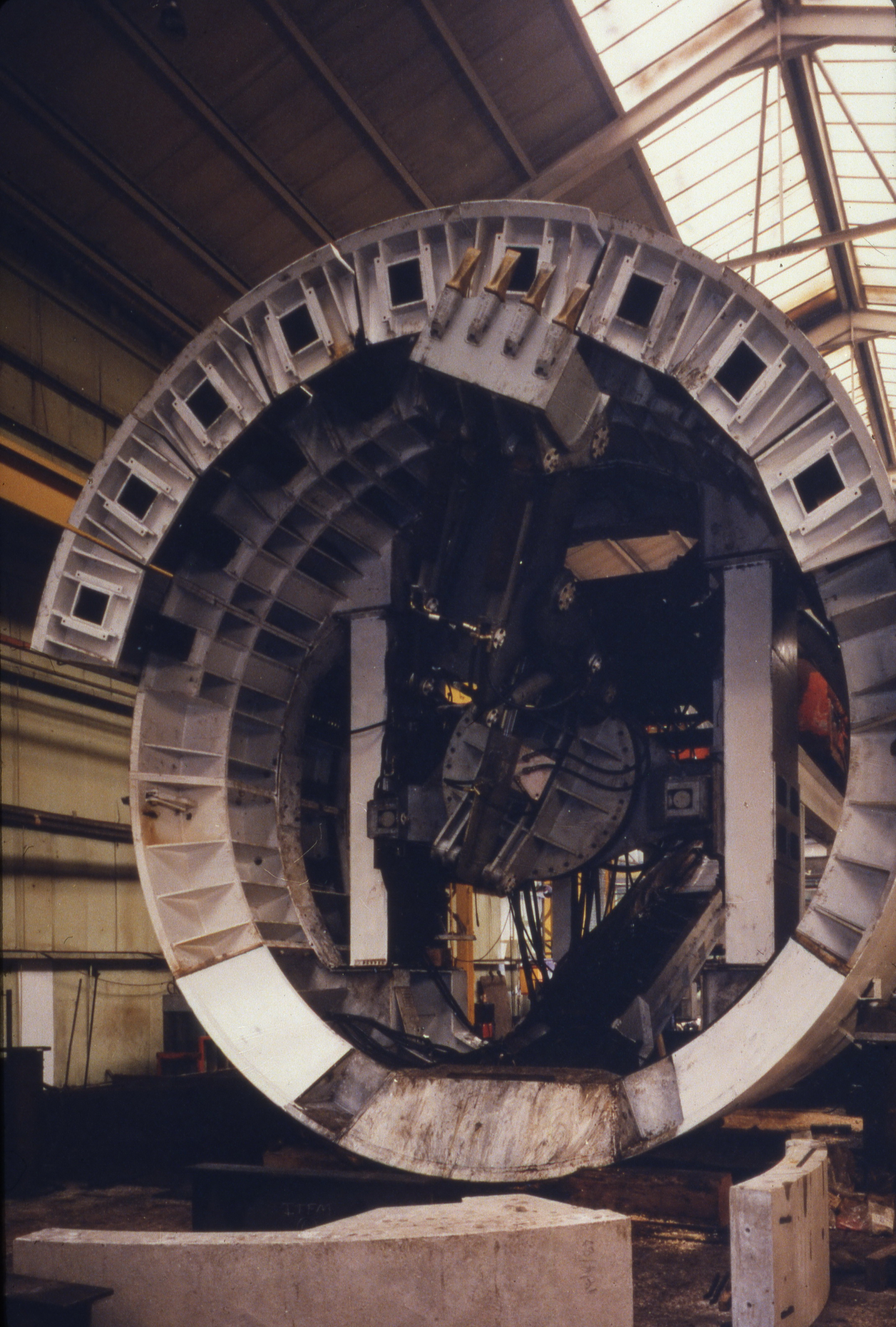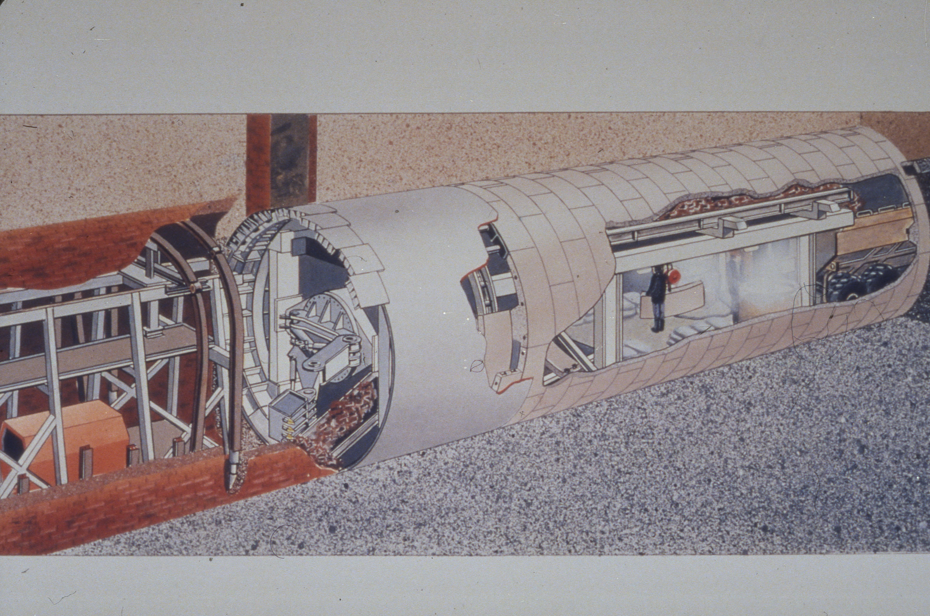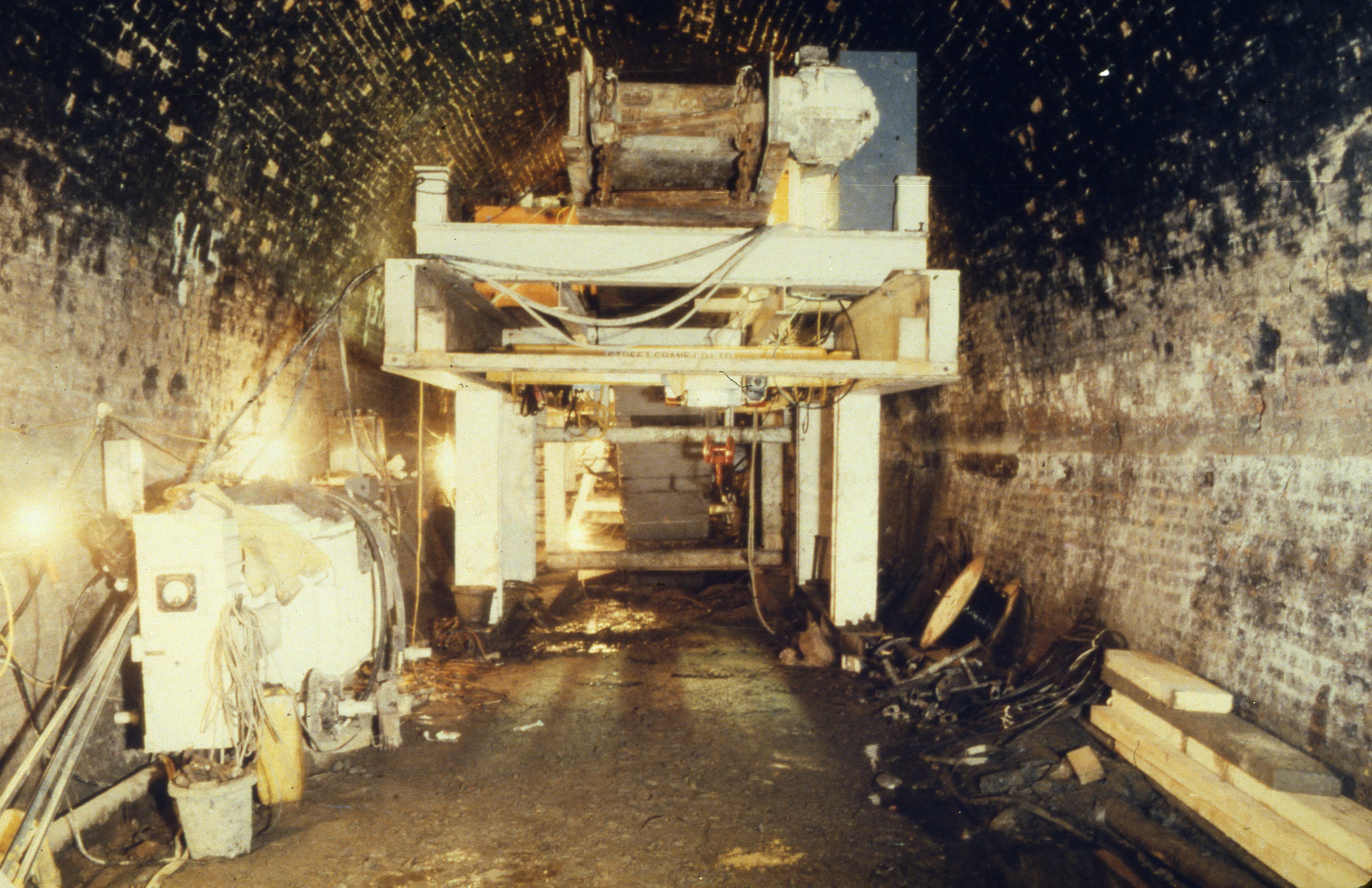 In March 1983, work began on the hand excavation of a chamber 8 metres long x 7.6 metres in diameter within the tunnel to provide a workshop in which the tunnel shield could then be erected.