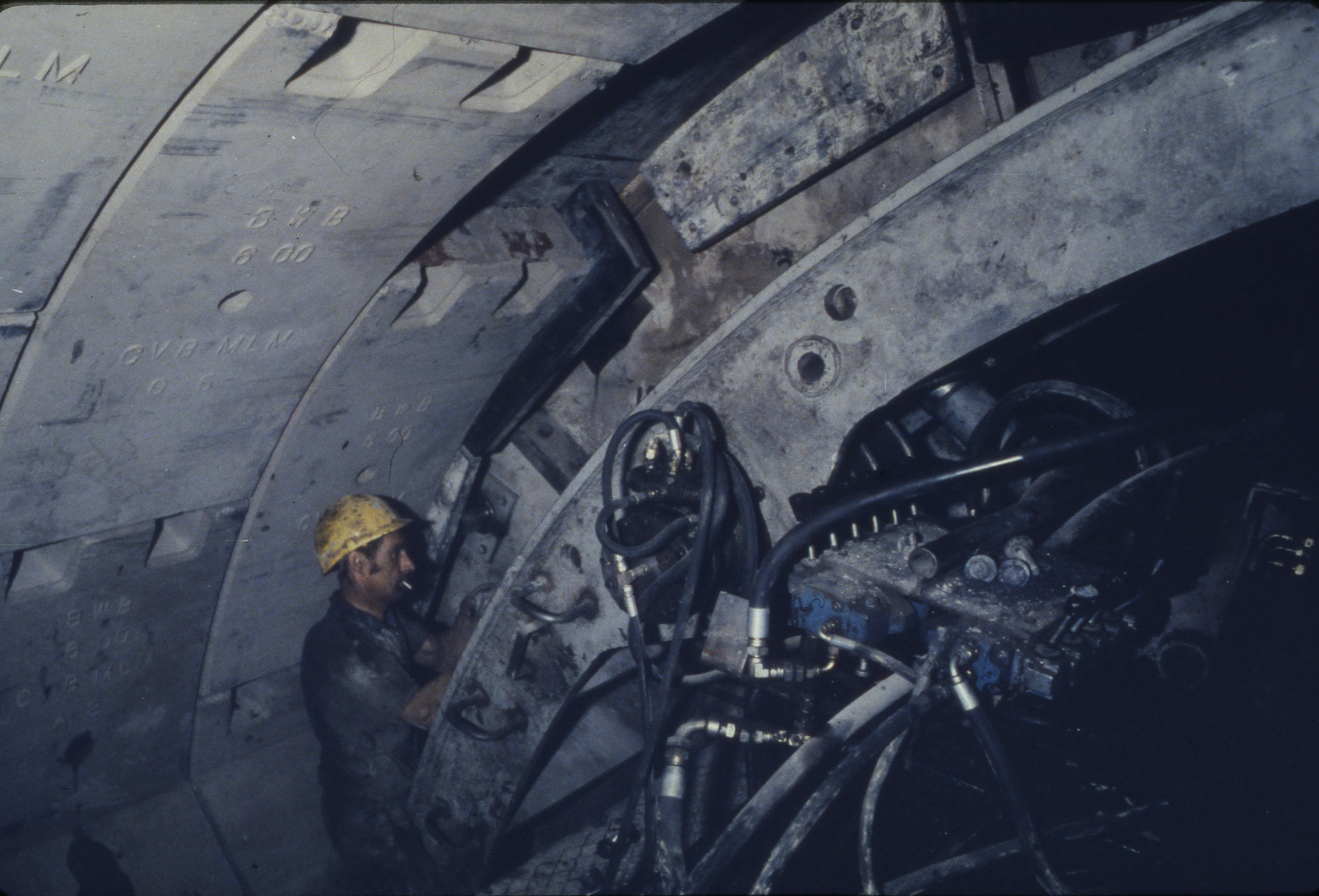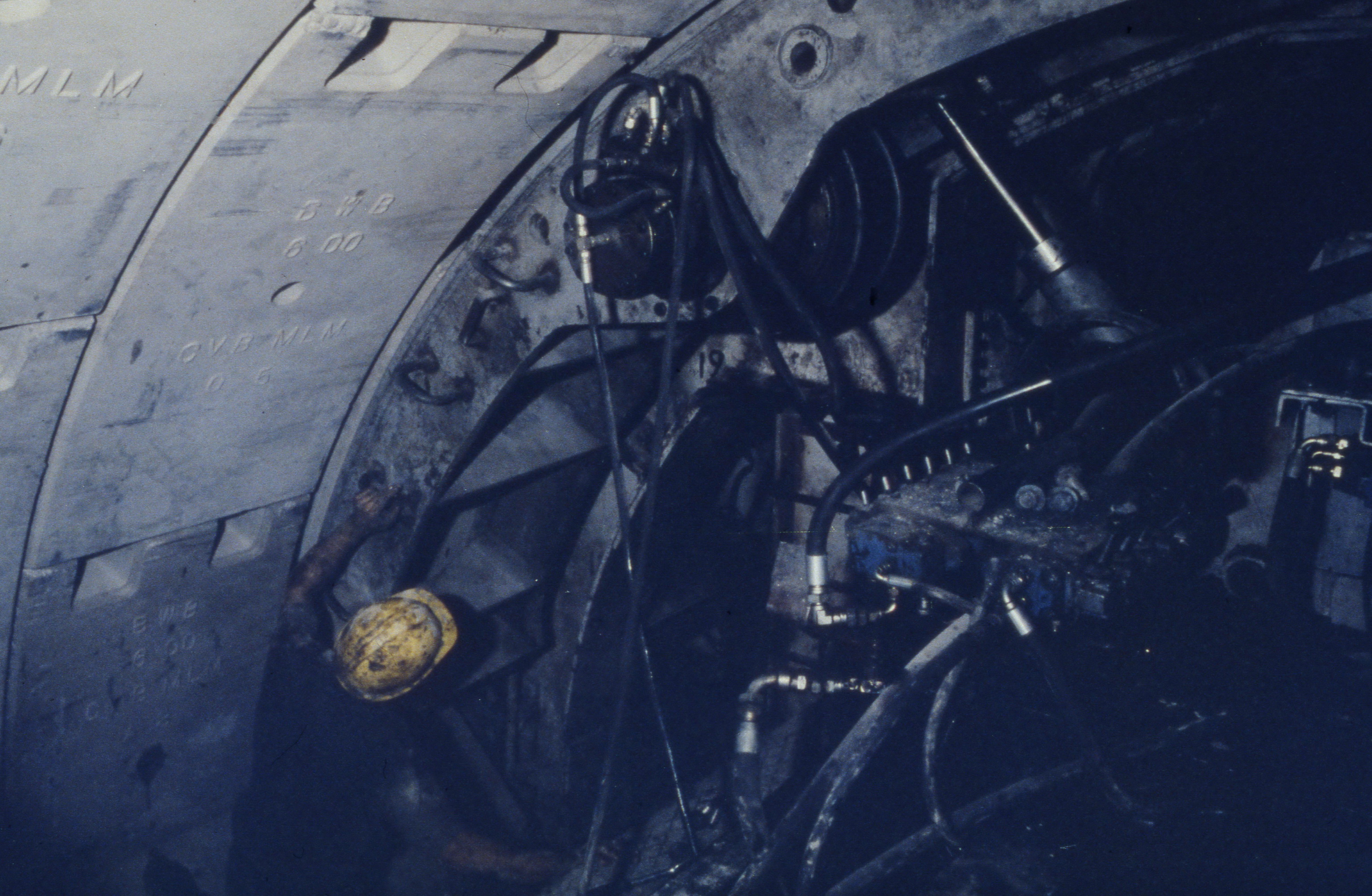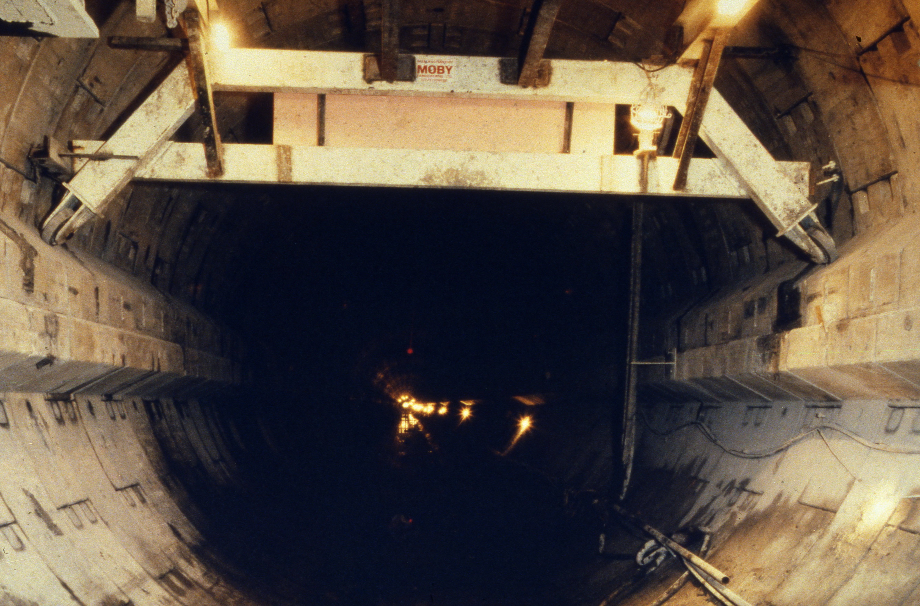 In March 1983, work began on the hand excavation of a chamber 8 metres long x 7.6 metres in diameter within the tunnel to provide a workshop in which the tunnel shield could then be erected.
