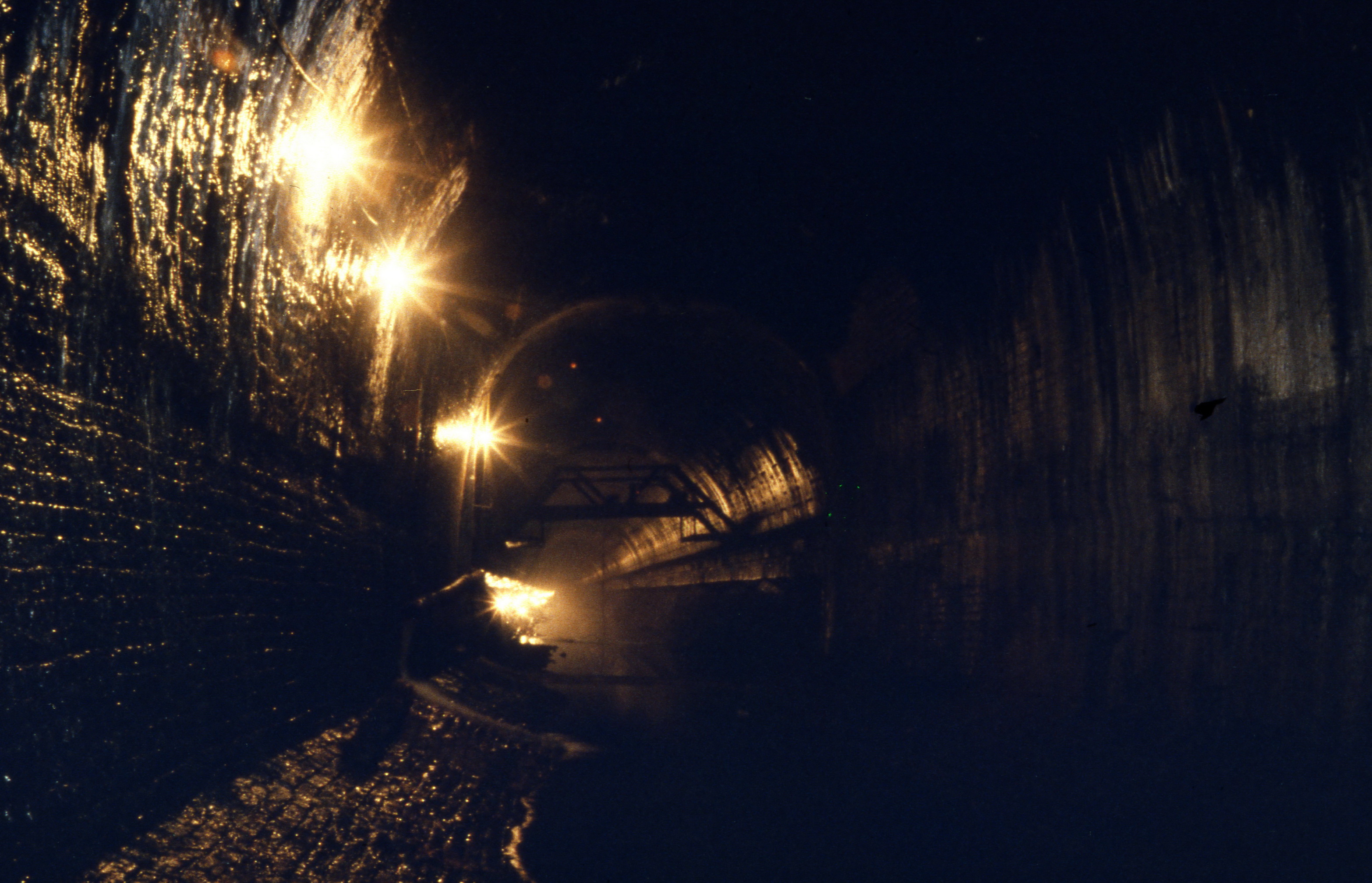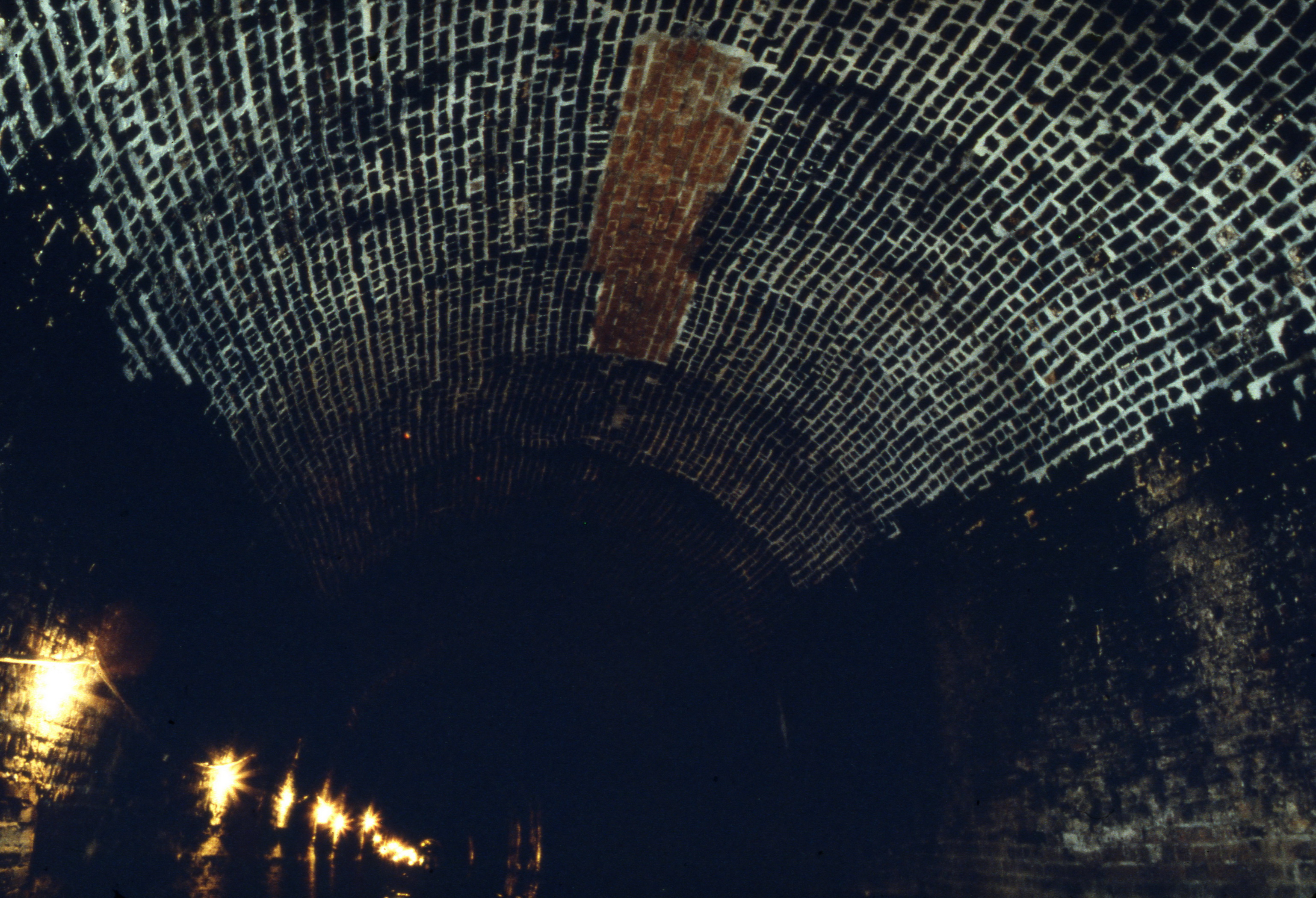 The new lining contrasts with the old brick tunnel. The relining work was completed at the end of 1983, and the shield dismantled and removed from the tunnel.