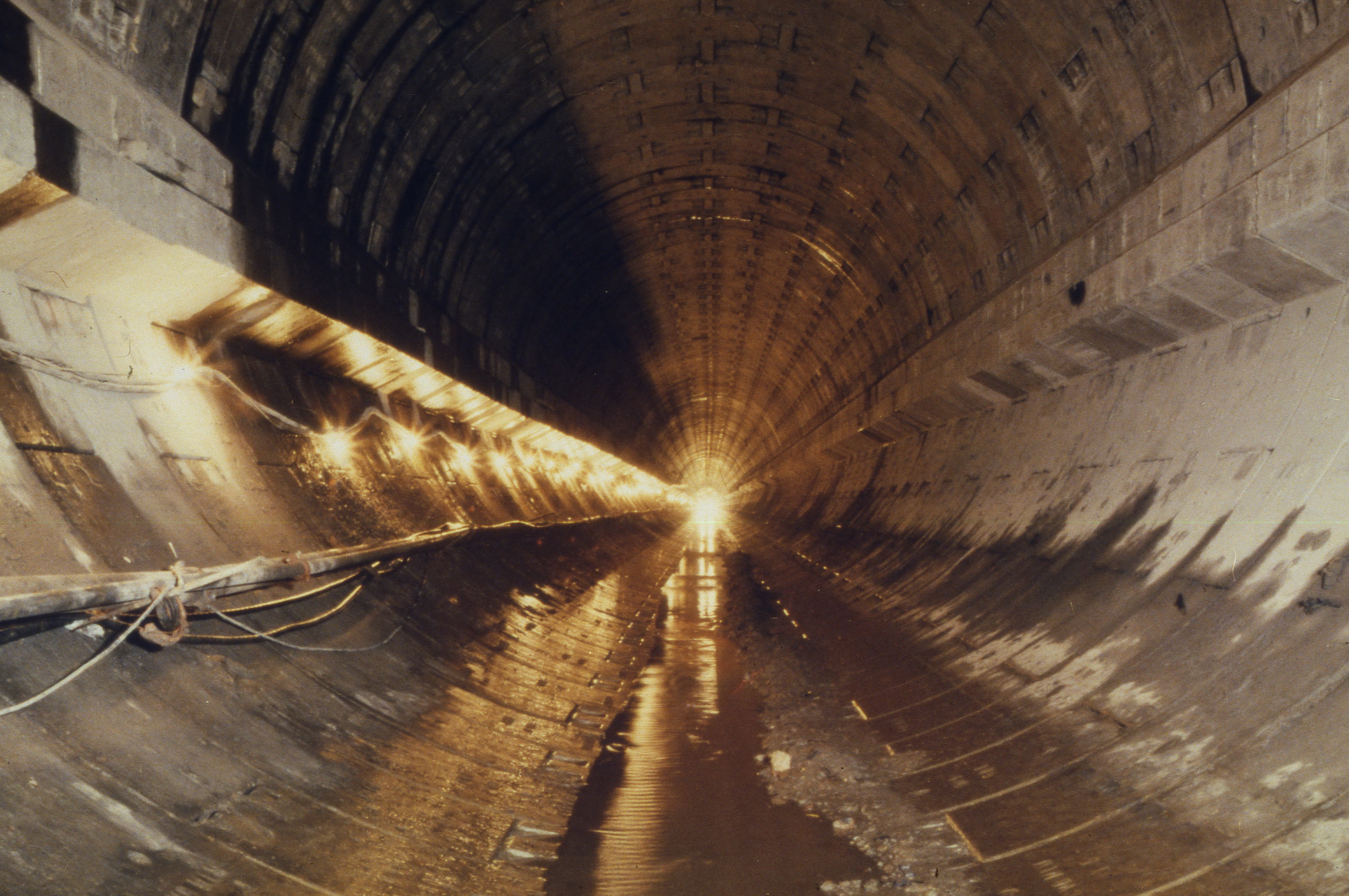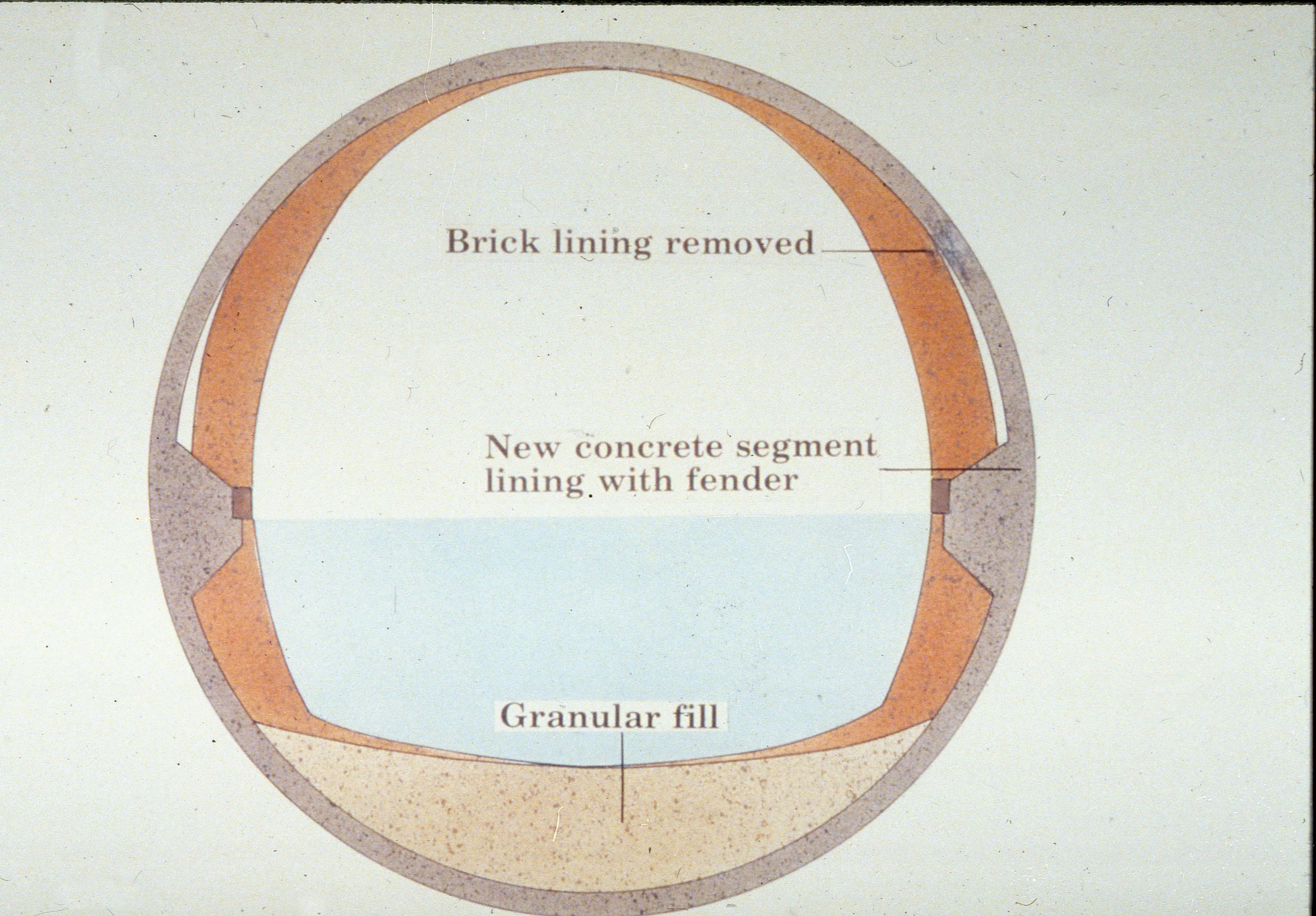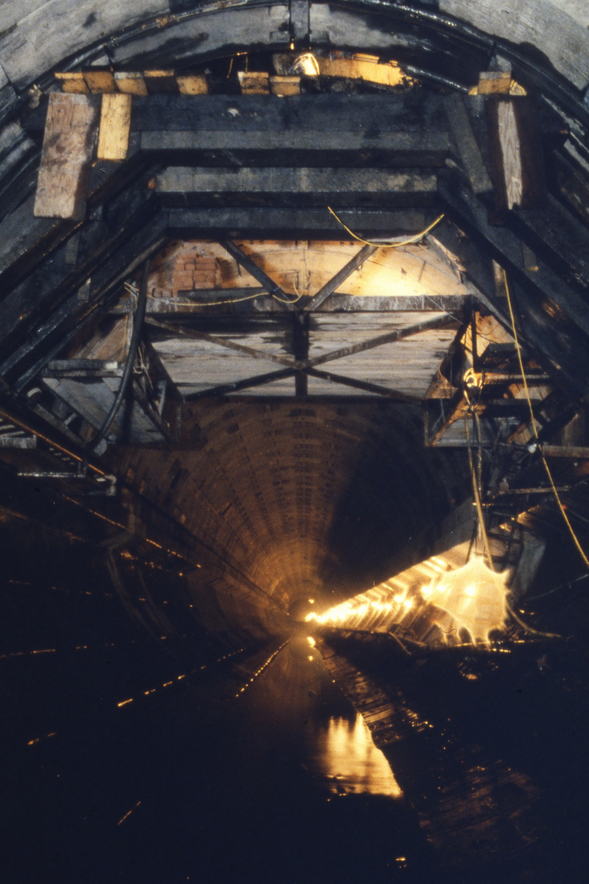 The solution chosen by the Board involved digging out all the old central section and relining it with pre-cast concrete rings. The machine designed to carry out this enormous task is a tunnel shield. Before the main works could commence, the works area was drained of water, and a temporary
